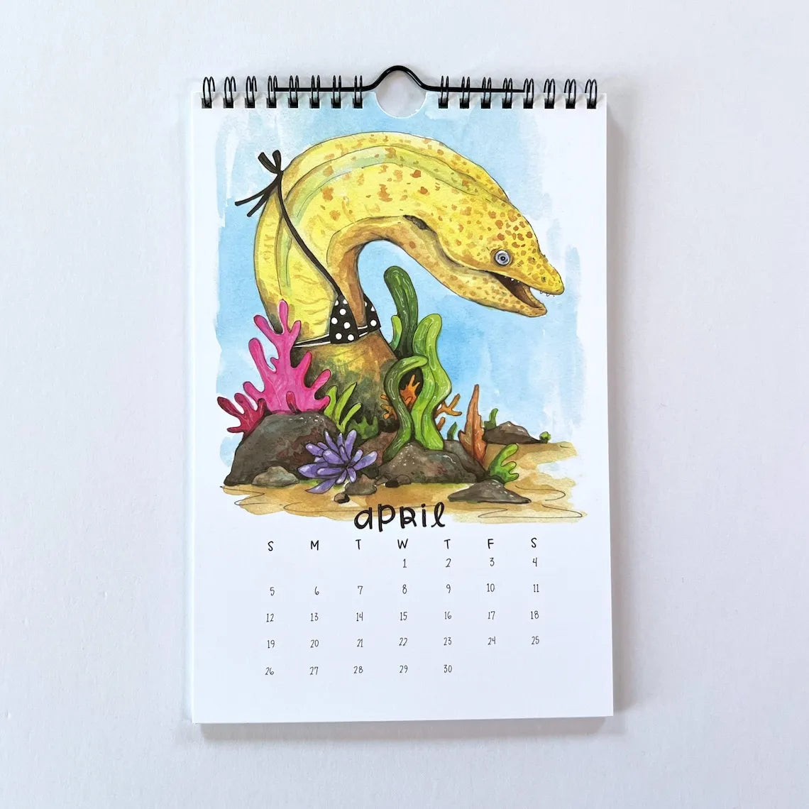 From a squirrel in a classic red-and-white striped bikini to cats sporting floral swimsuits and dogs riding floaties, this calendar brings a dose of whimsy and warmth to any room.