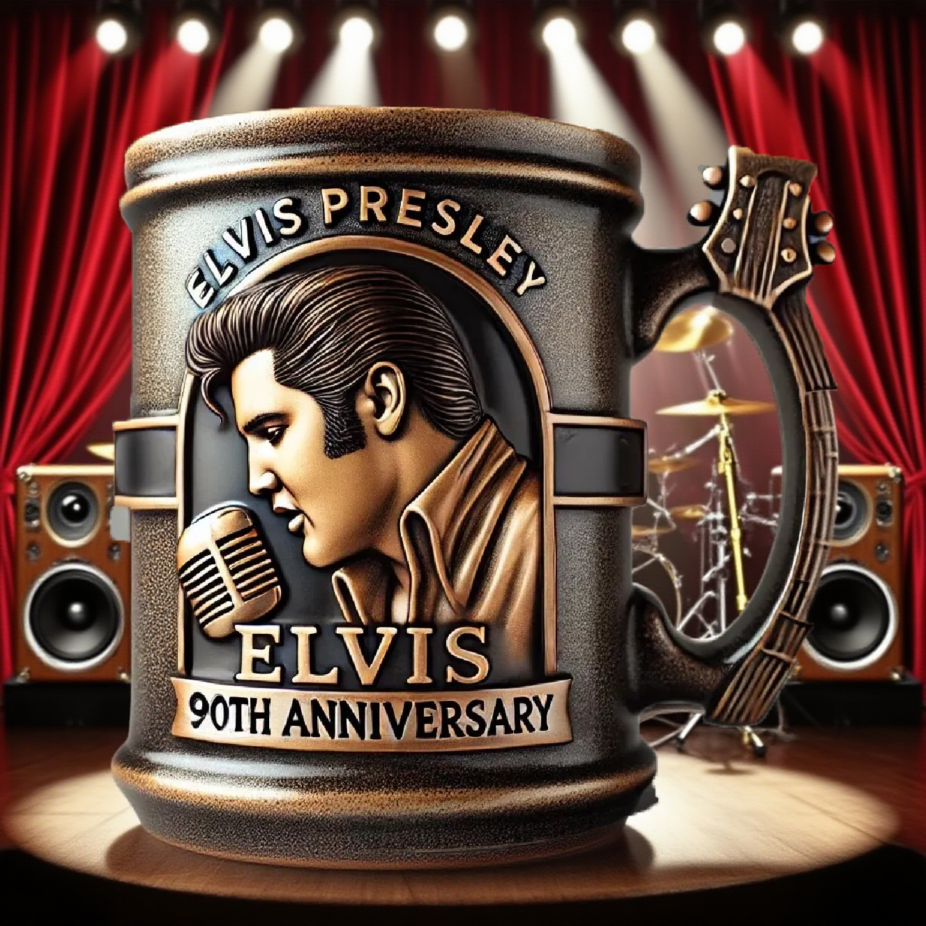 Elvis Presley 90th Anniversary Mug – A Tribute to the King of Rock ‘n’ Roll!Celebrate 90 years of the King of Rock ‘n’ Roll with this exclusive collector’s mug, a tribute to his timeless legacy and musical genius.