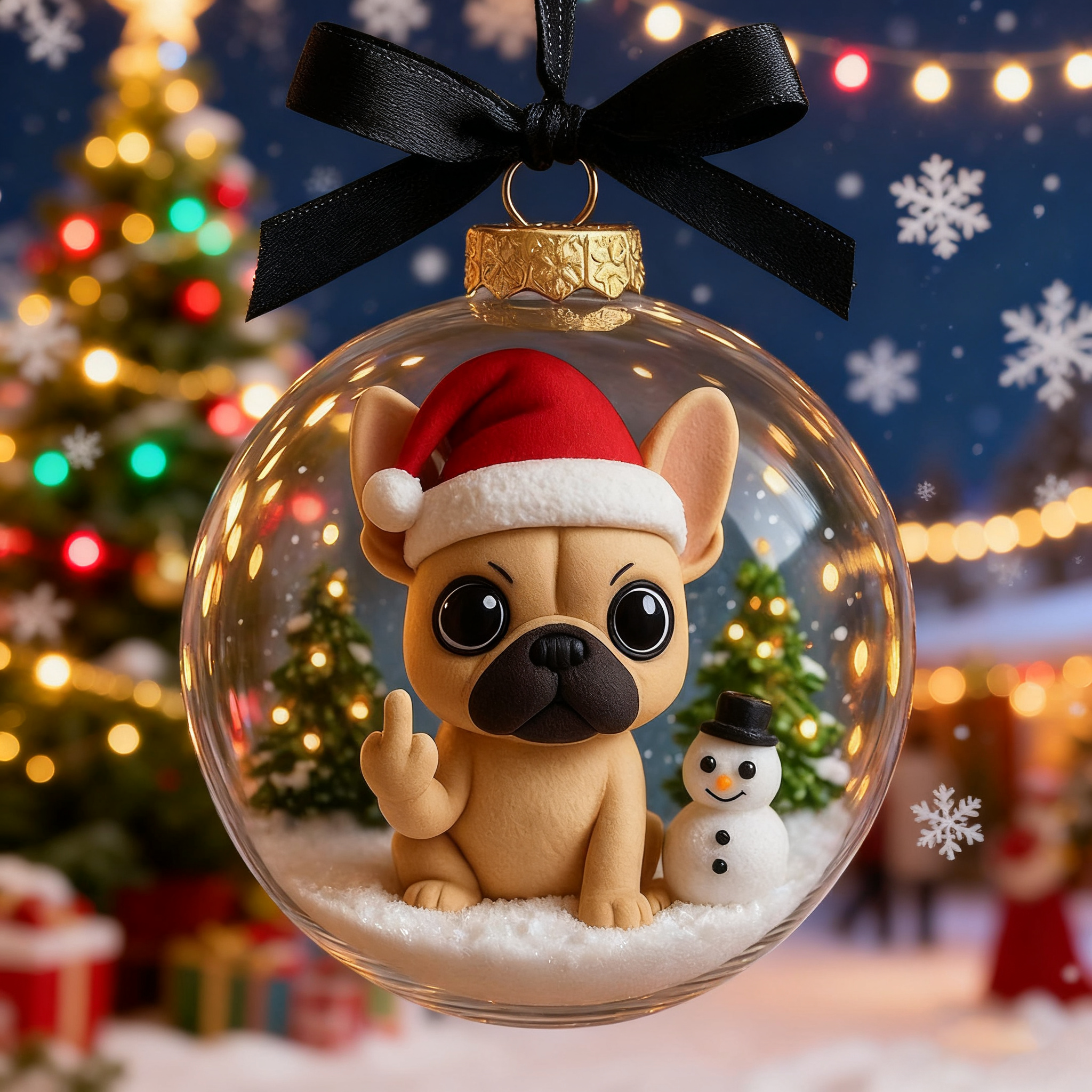 Make your Christmas tree unforgettable with this French Bulldog Christmas Ornament! Inside the transparent globe sits a chibi-style French Bulldog wearing a festive Santa hat, humorously raising its paw with a cheeky middle-finger gesture. The snowy base is complete with a tiny snowman and decorated Christmas trees, all glowing under warm holiday lights.