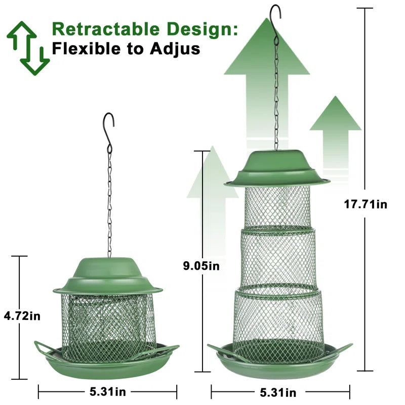 - Retractable Large Capacity: This large bird feeder can be retracted up and down. When the bird feeder is extended, it could be filled with a 4-pound large capacity for seeds like black oil sunflower or mixed with shelled nuts to attract birds such as cardinals, red finches, tits, golden finches, blue jays, sparrows, starlings, and more.