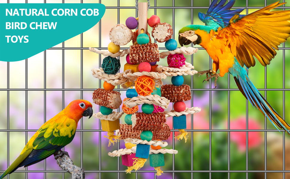 - NATURAL CORN COB MATERIAL: Made from natural corn cob, corn husk, rattan balls, wooden blocks, and beads, Comfybird's chew toy provides a safe and eco-friendly chewing experience for your feathered friends.