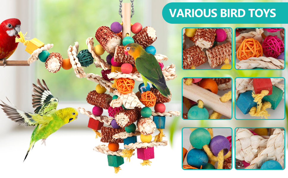 - SUPPORTS BEAK HEALTH: Chewing on the corn cob, wooden blocks, and rattan balls helps maintain healthy beak condition through natural wear, preventing overgrowth.