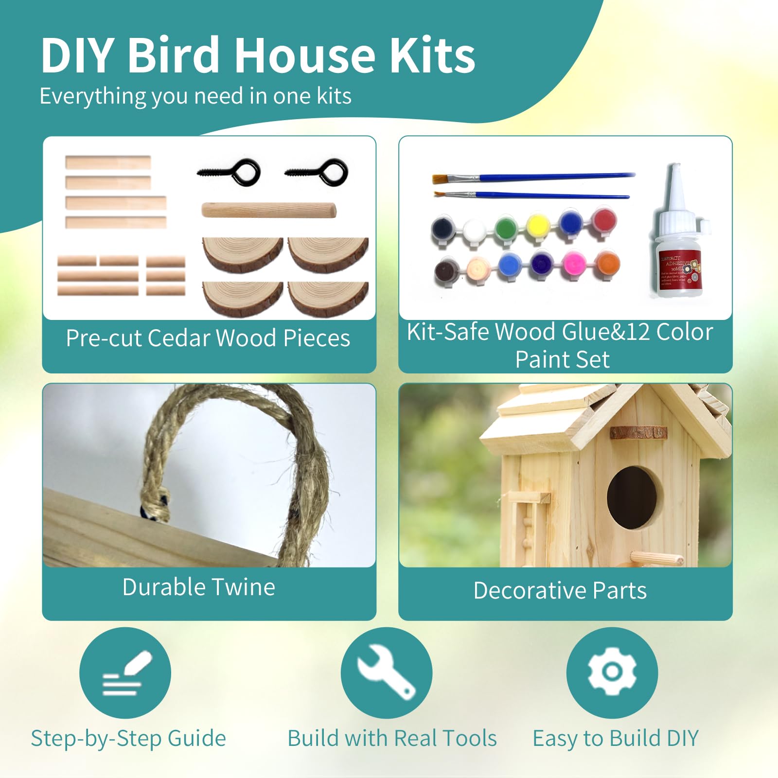 - Complete Crafting Kit: 11 cedar wood pieces, 4 cedar shingles, 2 nails, wood glue, 2 eye hooks, 1 perch, 2 brushes, 1 box of 12 color paintseasy-to-follow instructions for seamless crafting. Hammer not included.