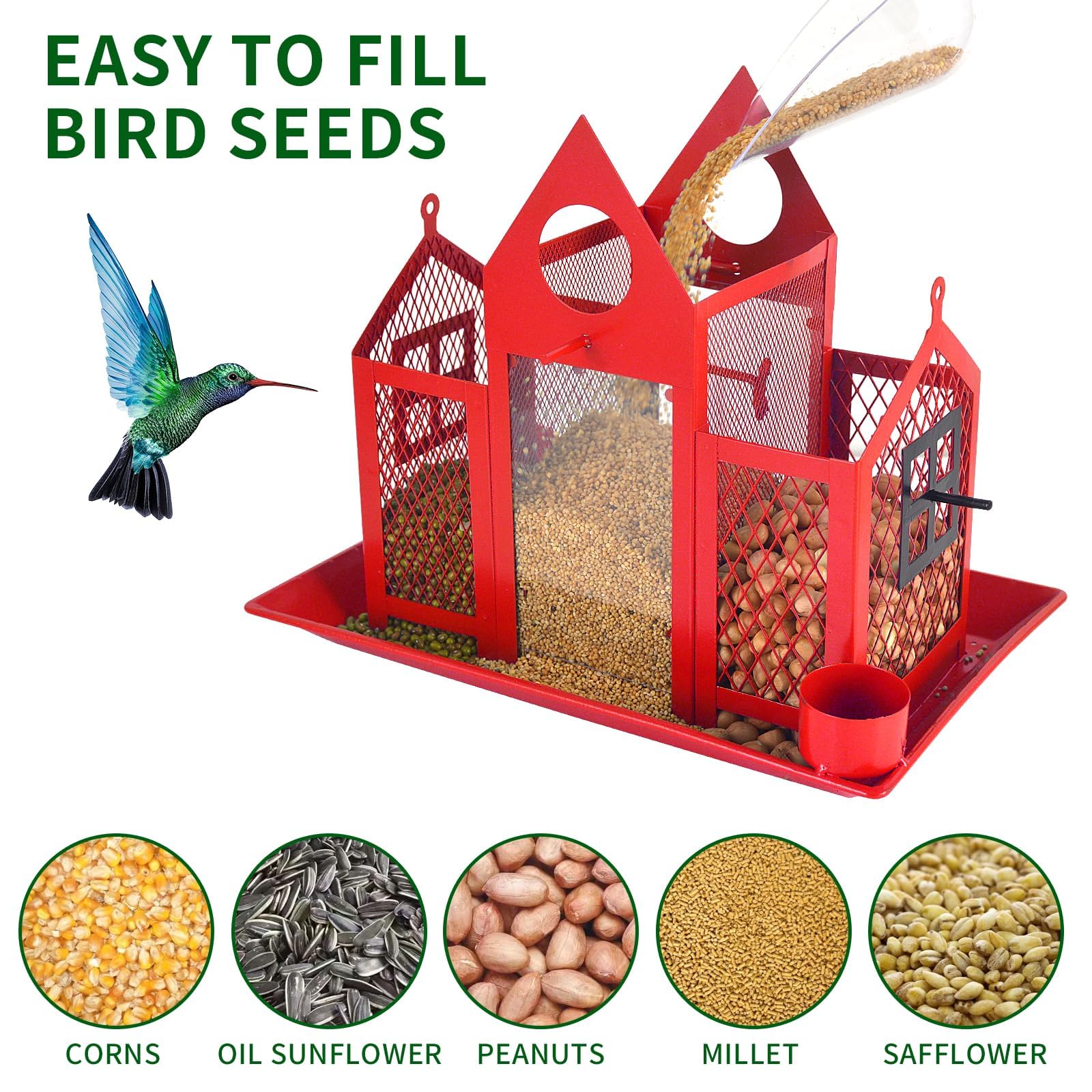 - Easy To Fill: This bird house a feeding window on the top left and right side, just open it to fill with birdseed, the bird feeder can hold up to 5 pounds of birdseed at a time.Perfect for attracting wild birds like goldfinch, cardinals, red finches, blue jays, sparrows, starlings, and more.