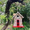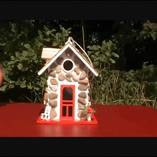 This quaint Stone Cottage Bird House has a pine shingled roof and features a sturdy, river stone façade as well as a window box and flower pot with bright red flowers. We've topped it all off with a white trimmed, red door detail and a white rocking chair.