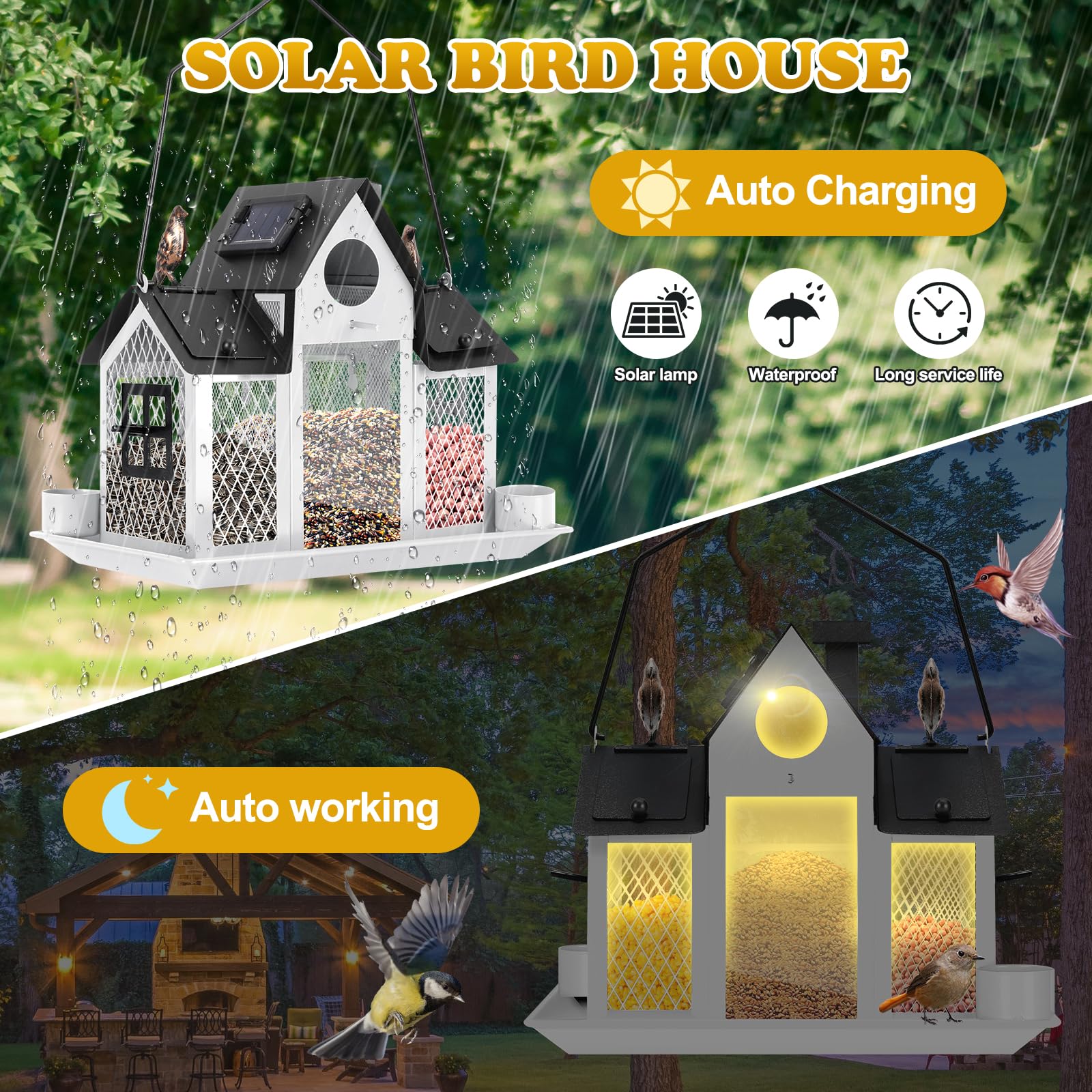 - Solar Powered Bird House: The solar bird feeder not only a bird house, but also a solar powered garden light, which attracts birds to forage for food during the day and lights up your garden at night without recharging.